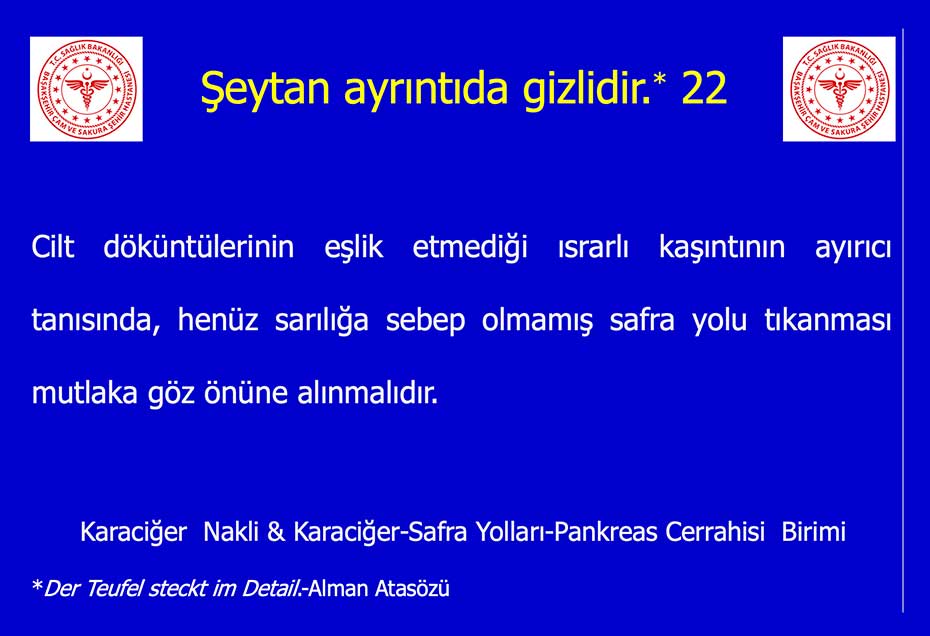 Cilt döküntülerinin eşlik etmediği ısrarlı kaşıntının ayırıcı tanısında, henüz sarılığa sebep olmamış safra yolu tıkanması mutlaka göz önüne alınmalıdır.