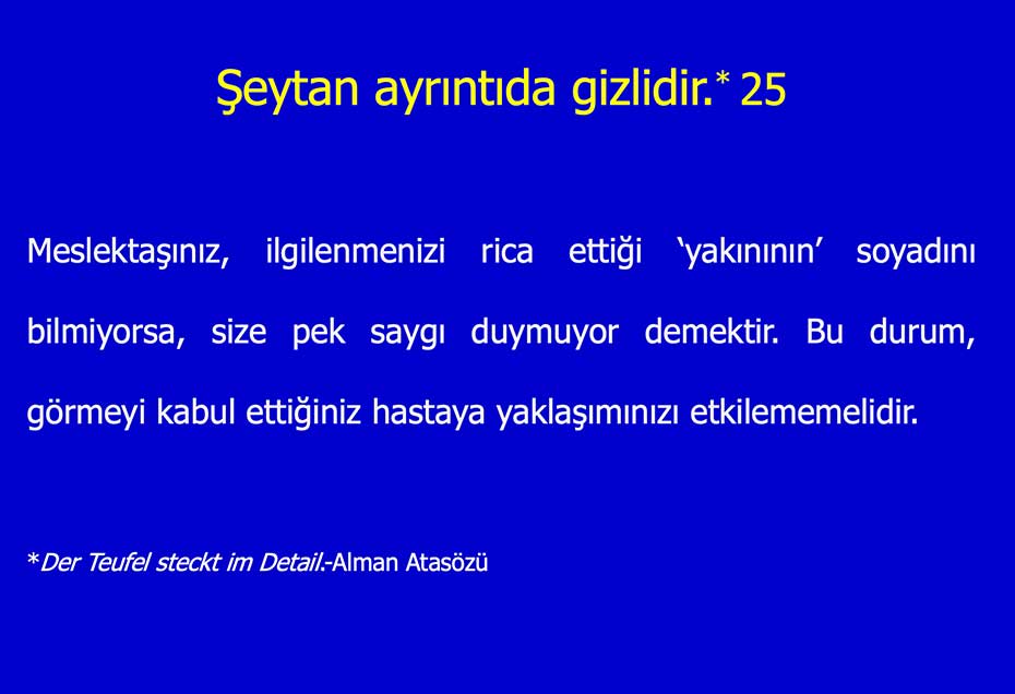 Meslektaşınız, ilgilenmenizi rica ettiği ‘yakınının’ soyadını bilmiyorsa, size pek saygı duymuyor demektir. Bu durum, görmeyi kabul ettiğiniz hastaya yaklaşımınızı etkilememelidir.