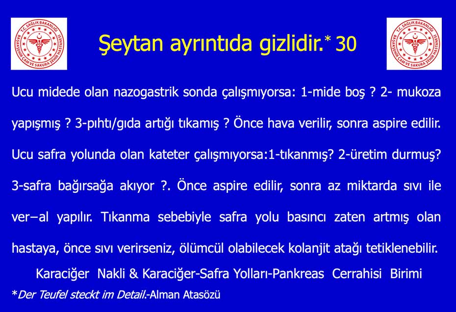Ucu midede olan nazogastrik sonda çalışmıyorsa: 1-mide boş? 2-mukoza yapışmış? 3-pıhtı/gıda artığı tıkamış? Önce hava verilir, sonra aspire edilir. Ucu safra yolunda olan kateter çalışmıyorsa: 1-tıkanmış? 2-üretim durmuş? 3-safra bağırsağa akıyor? Önce aspire edilir, sonra az miktarda sıvı ile ver–al yapılır. Tıkanma sebebiyle safra yolu basıncı zaten artmış olan hastaya, önce sıvı verirseniz, ölümcül olabilecek kolanjit atağı tetiklenebilir.