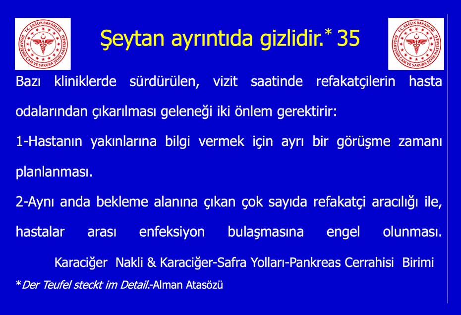 Bazı kliniklerde sürdürülen, vizit saatinde refakatçilerin hasta odalarından çıkarılması geleneği iki önlem gerektirir: 1-Hastanın yakınlarına bilgi vermek için ayrı bir görüşme zamanı planlanması. 2-Aynı anda bekleme alanına çıkan çok sayıda refakatçi aracılığı ile, hastalar arası enfeksiyon bulaşmasına engel olunması.