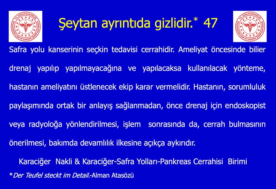 Safra yolu kanserinin seçkin tedavisi cerrahidir. Ameliyat öncesinde bilier drenaj yapılıp yapılmayacağına ve yapılacaksa kullanılacak yönteme, hastanın ameliyatını üstlenecek ekip karar vermelidir. Hastanın, sorumluluk paylaşımında ortak bir anlayış sağlanmadan, önce drenaj için endoskopist veya radyoloğa yönlendirilmesi, işlem sonrasında da, cerrah bulmasının önerilmesi, bakımda devamlılık ilkesine açıkça aykırıdır.