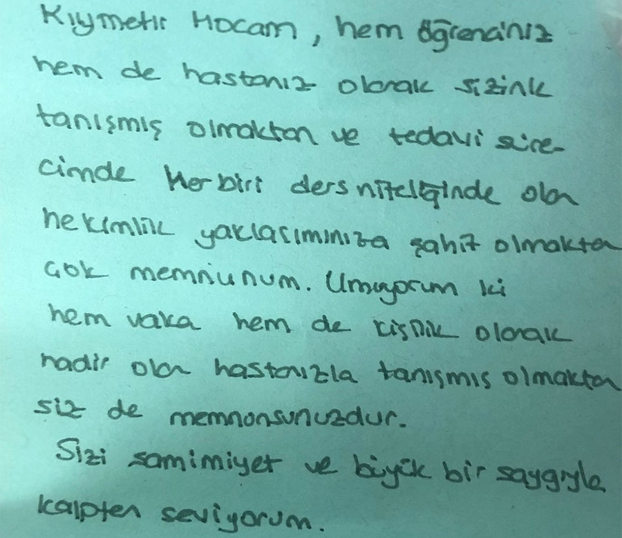 Kişisel numaramı bilmeyen meslektaşlarım, hastaları hakkında görüş alışverişinde bulunmak isterlerse, isimlerini ve kurumlarını ileten mesajlarına, memnuniyetle dönüş yaparım.