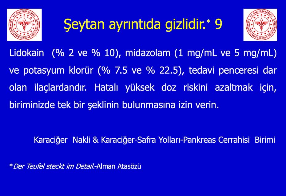 Lidokain (% 2 ve % 10), midazolam (1 mg/mL ve 5 mg/mL) ve potasyum klorür (% 7.5 ve % 22.5), tedavi penceresi dar olan ilaçlardandır. Hatalı yüksek doz riskini azaltmak için, biriminizde tek bir şeklinin bulunmasına izin verin.