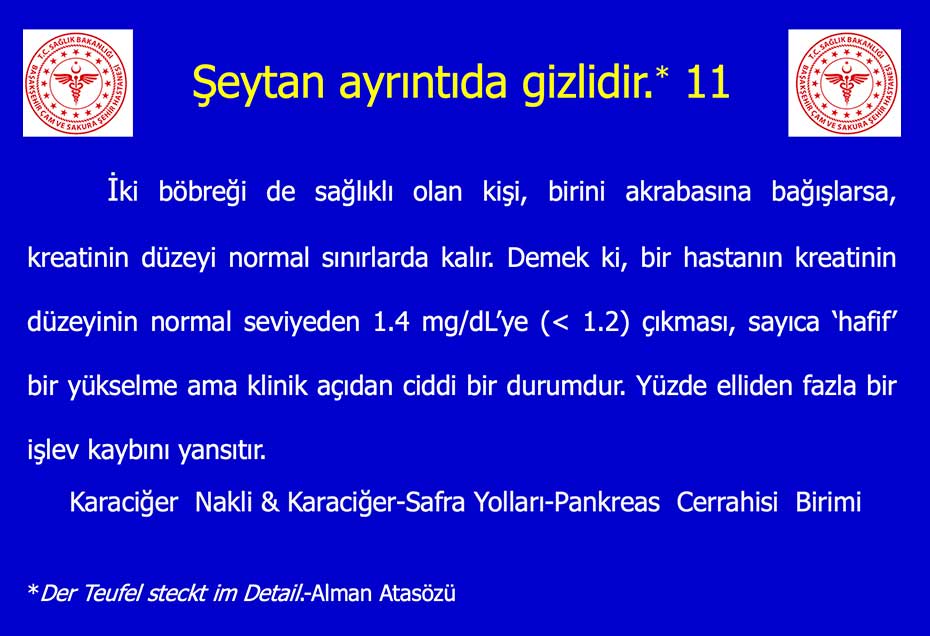 İki böbreği de sağlıklı olan kişi, birini akrabasına bağışlarsa, kreatinin düzeyi normal sınırlarda kalır. Demek ki, bir hastanın kreatinin düzeyinin normal seviyeden 1.4 mg/dL’ye (< 1.2) çıkması, sayıca ‘hafif’ bir yükselme ama klinik açıdan ciddi bir durumdur. Yüzde elliden fazla bir işlev kaybını yansıtır.