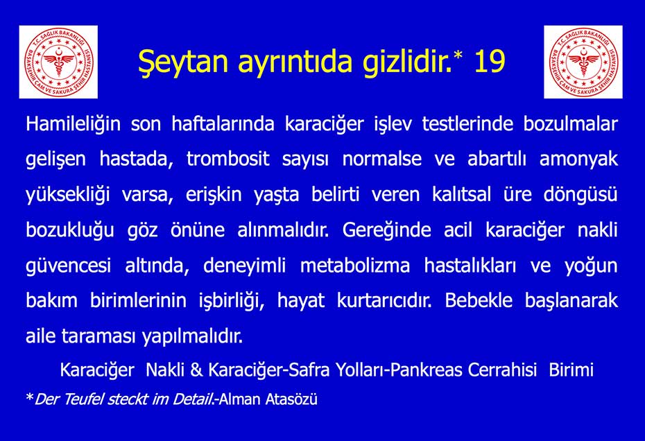 Hamileliğin son haftalarında karaciğer işlev testlerinde bozulmalar gelişen hastada, trombosit sayısı normalse ve abartılı amonyak yüksekliği varsa, erişkin yaşta belirti veren kalıtsal üre döngüsü bozukluğu göz önüne alınmalıdır. Gereğinde acil karaciğer nakli güvencesi altında, deneyimli metabolizma hastalıkları ve yoğun bakım birimlerinin işbirliği, hayat kurtarıcıdır. Bebekle başlanarak aile taraması yapılmalıdır.