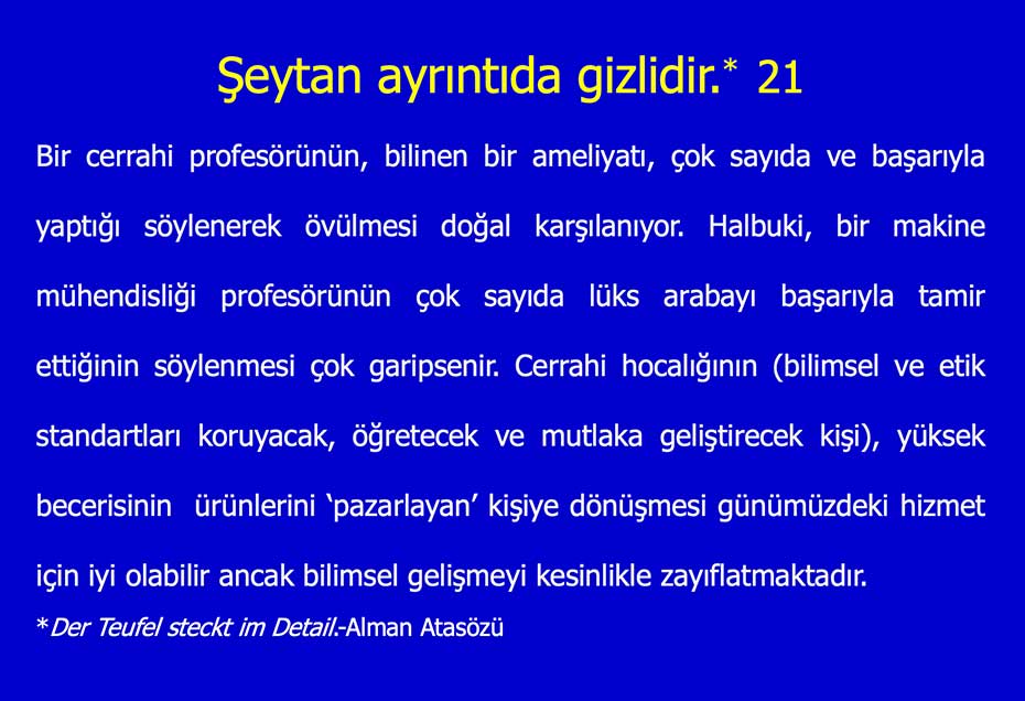 Bir cerrahi profesörünün, bilinen bir ameliyatı, çok sayıda ve başarıyla yaptığı söylenerek övülmesi doğal karşılanıyor. Halbuki, bir makine mühendisliği profesörünün çok sayıda lüks arabayı başarıyla tamir ettiğinin söylenmesi çok garipsenir. Cerrahi hocalığının (bilimsel ve etik standartları koruyacak, öğretecek ve mutlaka geliştirecek kişi), yüksek becerisinin ürünlerini ‘pazarlayan’ kişiye dönüşmesi günümüzdeki hizmet için iyi olabilir ancak bilimsel gelişmeyi kesinlikle zayıflatmaktadır.