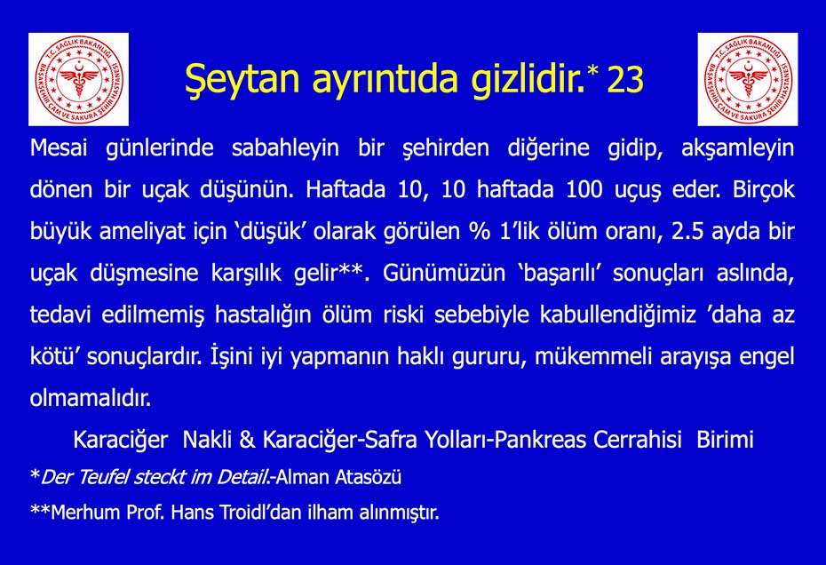 Mesai günlerinde sabahleyin bir şehirden diğerine gidip, akşamleyin dönen bir uçak düşünün. Haftada 10, 10 haftada 100 uçuş eder. Birçok büyük ameliyat için ‘düşük’ olarak görülen % 1’lik ölüm oranı, 2.5 ayda bir uçak düşmesine karşılık gelir. Günümüzün ‘başarılı’ sonuçları aslında, tedavi edilmemiş hastalığın ölüm riski sebebiyle kabullendiğimiz ‘daha az kötü’ sonuçlardır. İşini iyi yapmanın haklı gururu, mükemmeli arayışa engel olmamalıdır.