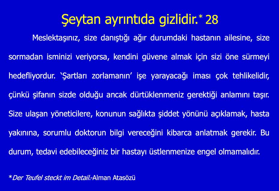Meslektaşınız, size danıştığı ağır durumdaki hastanın ailesine, size sormadan isminizi veriyorsa, kendini güvene almak için sizi öne sürmeyi hedefliyordur. ‘Şartları zorlamanın’ işe yarayacağı iması çok tehlikelidir, çünkü şifanın sizde olduğu ancak dürtüklenmeniz gerektiği anlamını taşır. Size ulaşan yöneticilere, konunun sağlıkta şiddet yönünü açıklamak, hasta yakınına, sorumlu doktorun bilgi vereceğini kibarca anlatmak gerekir. Bu durum, tedavi edebileceğiniz bir hastayı üstlenmenize engel olmamalıdır.