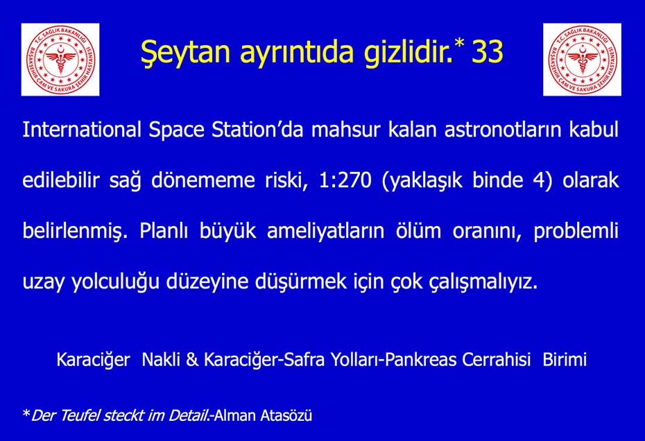 International Space Station’da mahsur kalan astronotların kabul edilebilir sağ dönememe riski, 1:270 (yaklaşık binde 4) olarak belirlenmiş. Planlı büyük ameliyatların ölüm oranını, problemli uzay yolculuğu düzeyine düşürmek için çok çalışmalıyız.
