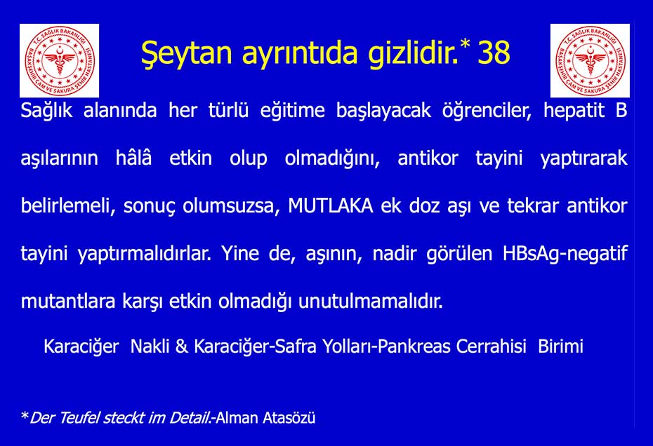Sağlık alanında her türlü eğitime başlayacak öğrenciler, hepatit B aşılarının hâlâ etkin olup olmadığını, antikor tayini yaptırarak belirlemeli, sonuç olumsuzsa, MUTLAKA ek doz aşı ve tekrar antikor tayini yaptırmalıdırlar. Yine de, aşının, nadir görülen HBsAg-negatif mutantlara kaartrşı etkin olmadığı unutulmamalıdır.