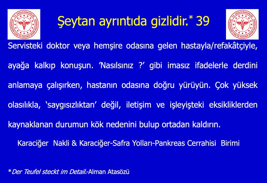 Servisteki doktor veya hemşire odasına gelen hastayla/refakâtçiyle, ayağa kalkıp konuşun. ‘Nasılsınız?’ gibi imasız ifadelerle derdini anlamaya çalışırken, hastanın odasına doğru yürüyün. Çok yüksek olasılıkla, ‘saygısızlıktan’ değil, iletişim ve işleyişteki eksikliklerden kaynaklanan durumun kök nedenini bulup ortadan kaldırın.