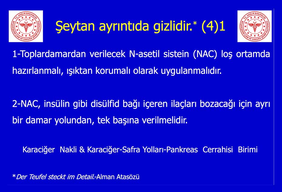 - Toplardamardan verilecek N-asetil sistein (NAC) loş ortamda hazırlanmalı, ışıktan korumalı olarak uygulanmalıdır.