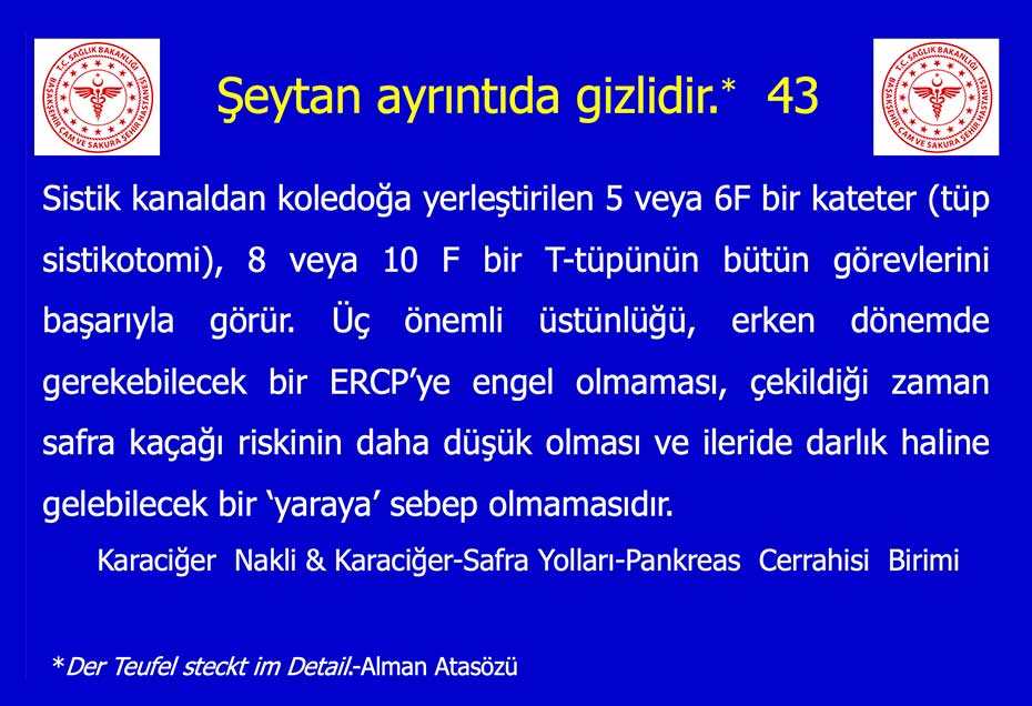 Sistik kanaldan koledoğa yerleştirilen 5 veya 6F bir kateter (tüp sistikotomi), 8 veya 10 F bir T-tüpünün bütün görevlerini başarıyla görür. Üç önemli üstünlüğü, erken dönemde gerekebilecek bir ERCP’ye engel olmaması, çekildiği zaman safra kaçağı riskinin daha düşük olması ve ileride darlık haline gelebilecek bir ‘yaraya’ sebep olmamasıdır.