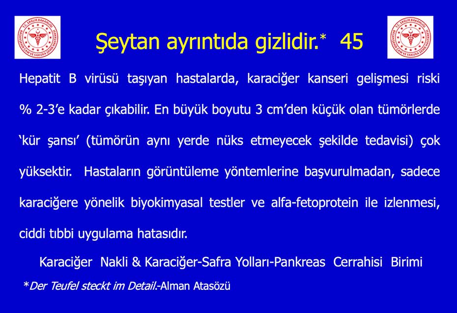 Hepatit B virüsü taşıyan hastalarda, karaciğer kanseri gelişmesi riski % 2-3’e kadar çıkabilir. En büyük boyutu 3 cm’den küçük olan tümörlerde ‘kür şansı’ (tümörün aynı yerde nüks etmeyecek şekilde tedavisi) çok yüksektir. Hastaların görüntüleme yöntemlerine başvurulmadan, sadece karaciğere yönelik biyokimyasal testler ve alfa-fetoprotein ile izlenmesi, ciddi tıbbi uygulama hatasıdır.