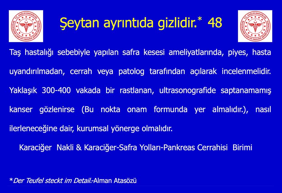 Taş hastalığı sebebiyle yapılan safra kesesi ameliyatlarında, piyes, hasta uyandırılmadan, cerrah veya patolog tarafından açılarak incelenmelidir. Yaklaşık 300-400 vakada bir rastlanan, ultrasonografide saptanamamış kanser gözlenirse (Bu nokta onam formunda yer almalıdır.), nasıl ilerleneceğine dair, kurumsal yönerge olmalıdır.