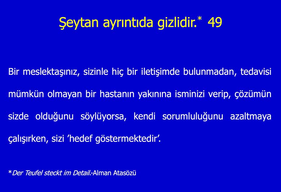 Bir meslektaşınız, sizinle hiç bir iletişimde bulunmadan, tedavisi mümkün olmayan bir hastanın yakınına isminizi verip, çözümün sizde olduğunu söylüyorsa, kendi sorumluluğunu azaltmaya çalışırken, sizi ‘hedef göstermektedir’.