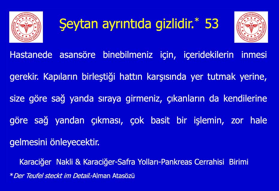 Hastanede asansöre binebilmeniz için, içeridekilerin inmesi gerekir. Kapıların birleştiği hattın karşısında yer tutmak yerine, size göre sağ yanda sıraya girmeniz, çıkanların da kendilerine göre sağ yandan çıkması, çok basit bir işlemin, zor hale gelmesini önleyecektir.