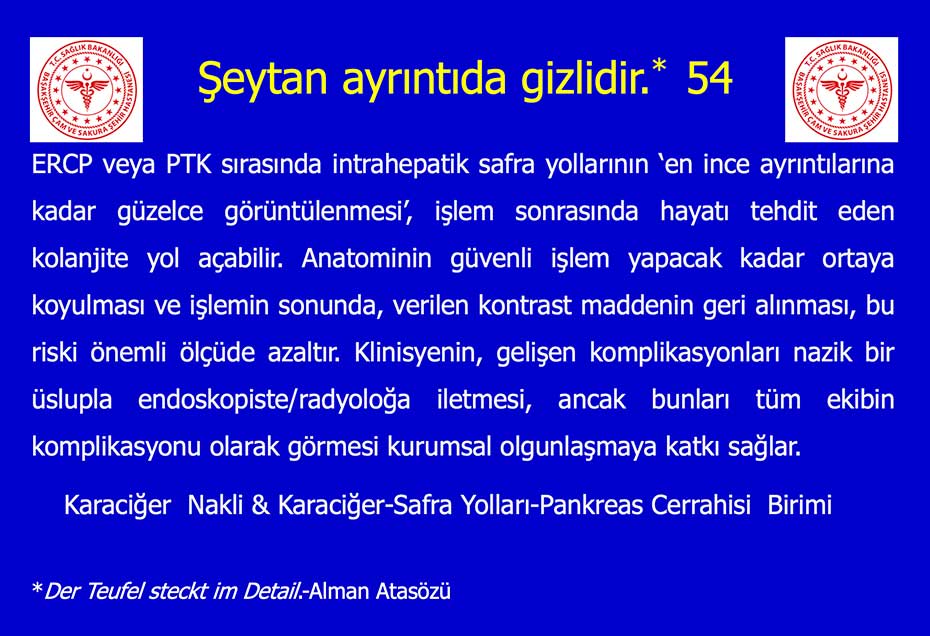 ERCP veya PTK sırasında intrahepatik safra yollarının ‘en ince ayrıntılarına kadar güzelce görüntülenmesi’, işlem sonrasında hayatı tehdit eden kolanjite yol açabilir. Anatominin güvenli işlem yapacak kadar ortaya koyulması ve işlemin sonunda, verilen kontrast maddenin geri alınması, bu riski önemli ölçüde azaltır. Klinisyenin, gelişen komplikasyonları nazik bir üslupla endoskopiste/radyoloğa iletmesi, ancak bunları tüm ekibin komplikasyonu olarak görmesi kurumsal olgunlaşmaya katkı sağlar.